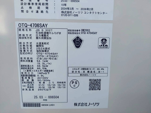 都城市山之口町山之口 ノーリツ給湯器→ノーリツ石油給湯機付ふろがまOTQ-4706SAY 給湯器交換工事
